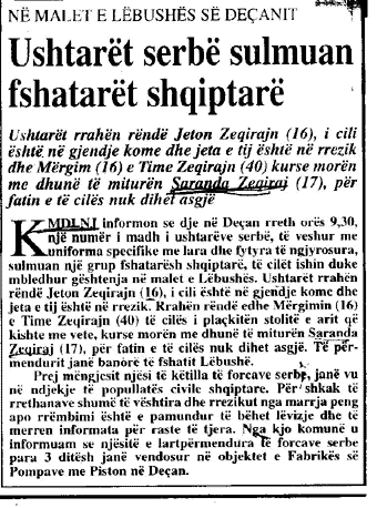 The Skenderaj chapter of the Prishtina-based Council for the Defense of Human Rights and Freedoms (CDHRF) identified the three victims as Fatime Geci (73) and Mevlude Geci (45), residents of Llausha, and Hamide Taraku (51), mother of eight children from Vitak. Fatime Geci and Mevlude Geci were both disabled women and could not run away when Serb troops advanced into the village. The third woman, Hamide Taraku, had come earlier this year to the village to seek shelter with her relatives.